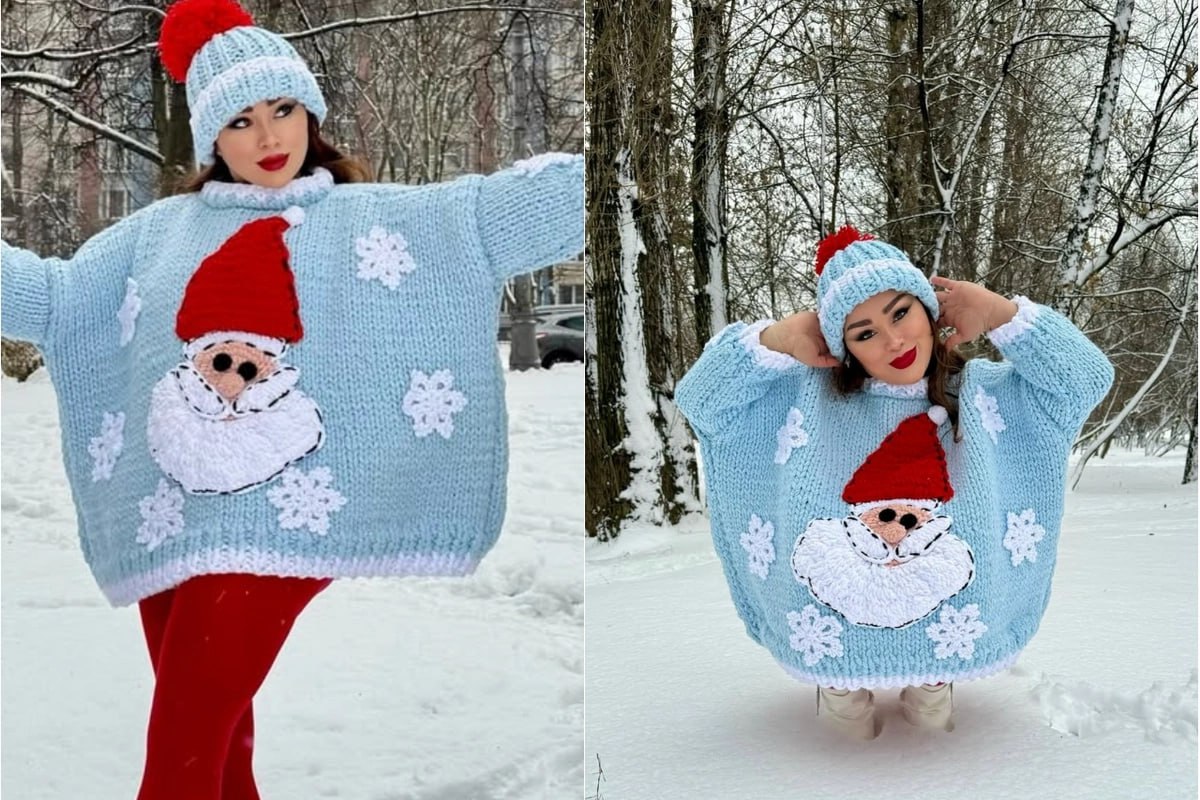 Xatirə fotosessiyasında qırmızı və mavi rəngli qalın qış geyimlərindən istifadə edib.
