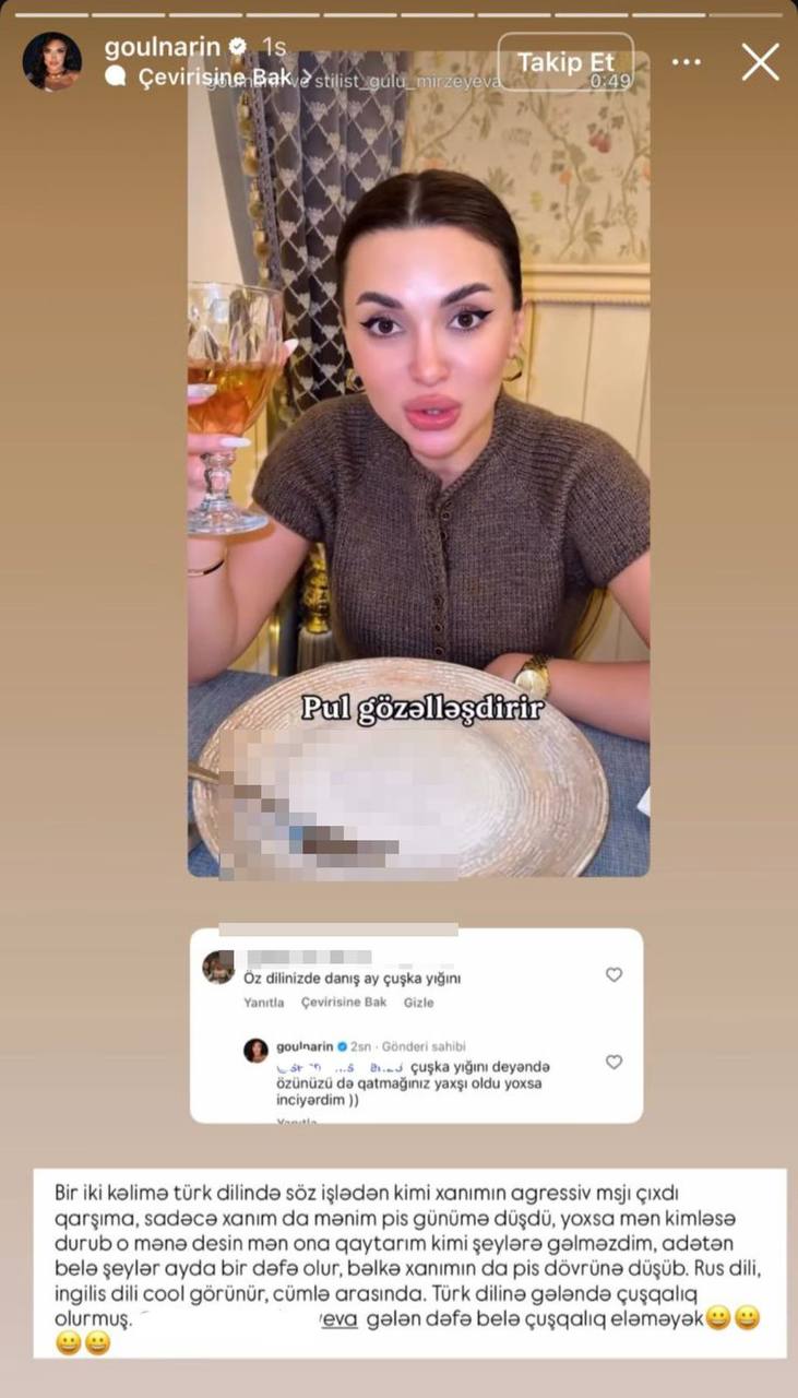 Belə ki, Gülnar onun videolarından birinə “Öz dilinizdə danış, ay “çuşka” yığını” şərhini yazan istifadəçiyə sərt cavab verib. ““Çuşka yığını” deyəndə özünüzü də qatmağınız yaxşı oldu, yoxsa inciyərdim”, - deyə bloger bildirib.