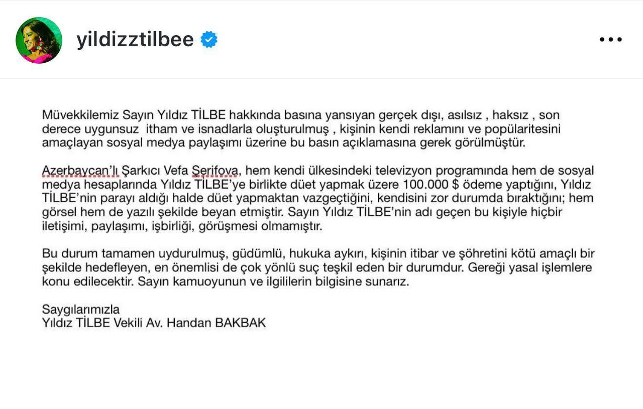 “Müvəkkilimiz Yıldız Tilbe haqqında mediada əks olunan, həqiqətə uyğun olmayan, əsassız, haqsız və son dərəcə uyğunsuz ittiham və iddialarla hazırlanmış, şəxsi reklam və populyarlıq məqsədi daşıyan sosial media paylaşımı ilə bağlı bu mətbuat açıqlamasının verilməsi zəruri hesab edilmişdir.
