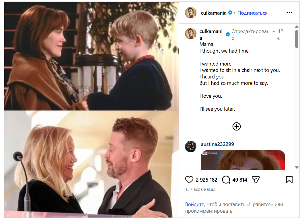 Məşhur “Evdə tək” filmində “Kevin” obrazını oynayan aktyor Makoley Kalkin ekran işində anası rolunu canlandırmış Ketrin O'Haranın vəfatı ilə bağlı sosial şəbəkə hesabında təsirli paylaşım edib.