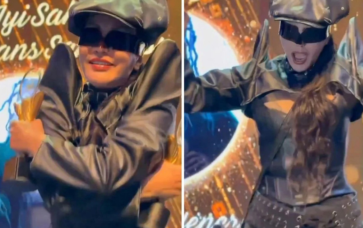 Bizim.Media xəbər verir ki, qeyri-adi geyimi ilə gecəyə damğa vuran müğənni mükafatını almaq üçün səhnəyə çıxaraq tamaşaçıları salamlayıb.