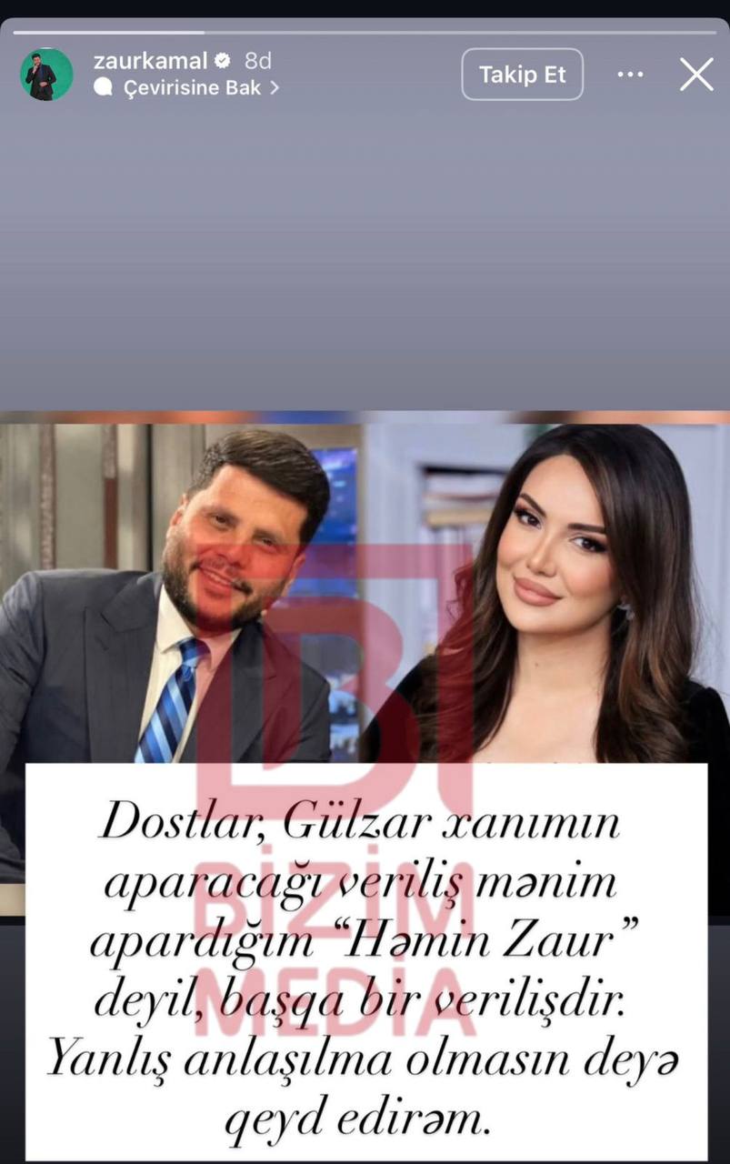 “Dostlar, Gülzar xanımın aparacağı veriliş mənim apardığım “Həmin Zaur” deyil. Başqa bir verilişdir. Yanlış anlaşılma olmasın deyə qeyd edirəm”, - deyə, Zaur bildirib.