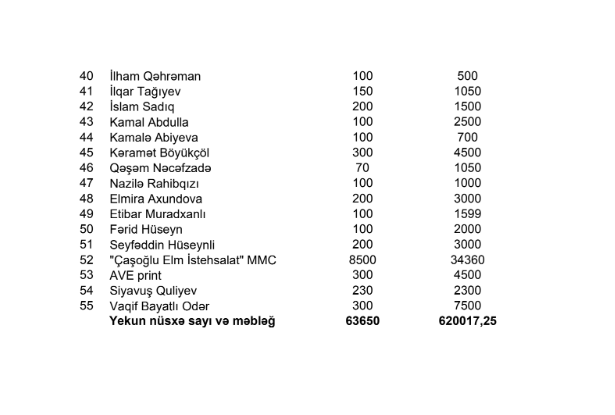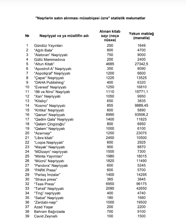 Bir sıra müəlliflərin əsərləri kitablarının buraxılışını həyata keçirən nəşriyyatlar (“Aspoliqraf”, “Təhsil”, “Zərdabi-nəşr” və s.) vasitəsilə alınıb.
