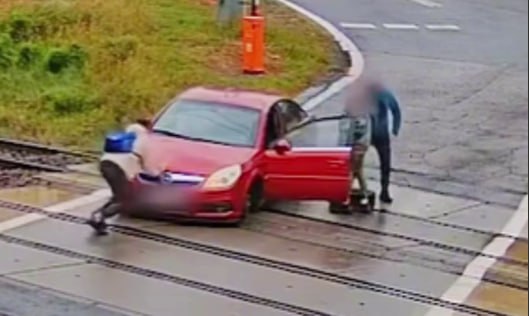 Polşanın Katovitse şəhərində dəmir yolu keçidində təhlükəli anlar yaşanıb.