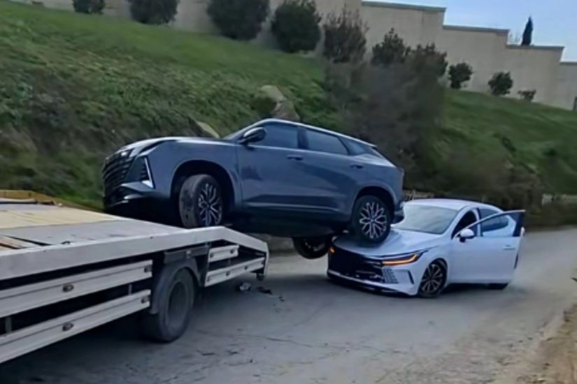 Bizim.Media xəbər verir ki, evakuatorun üzərində daşınan avtomobil hərəkət zamanı tarazlığını itirərək arxadan gələn minik maşınının üstünə düşüb.