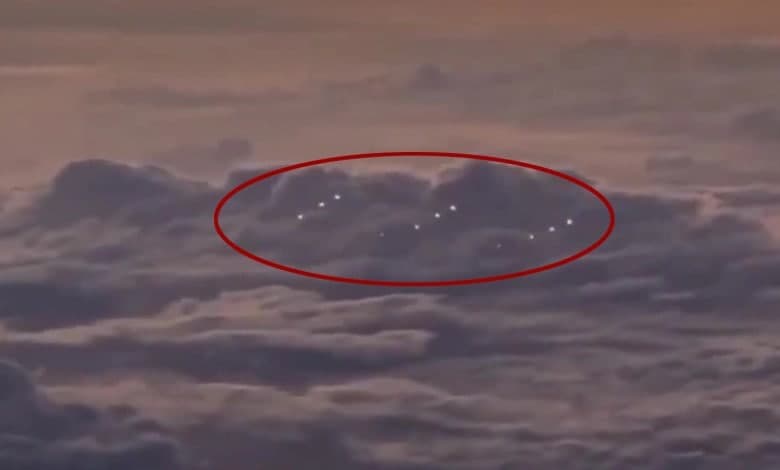 53 saniyəlik kadrlarda buludların üzərində ahənglə uçan və hərəsində 4 naməlum obyektin yer aldığı 2 dəstə var.