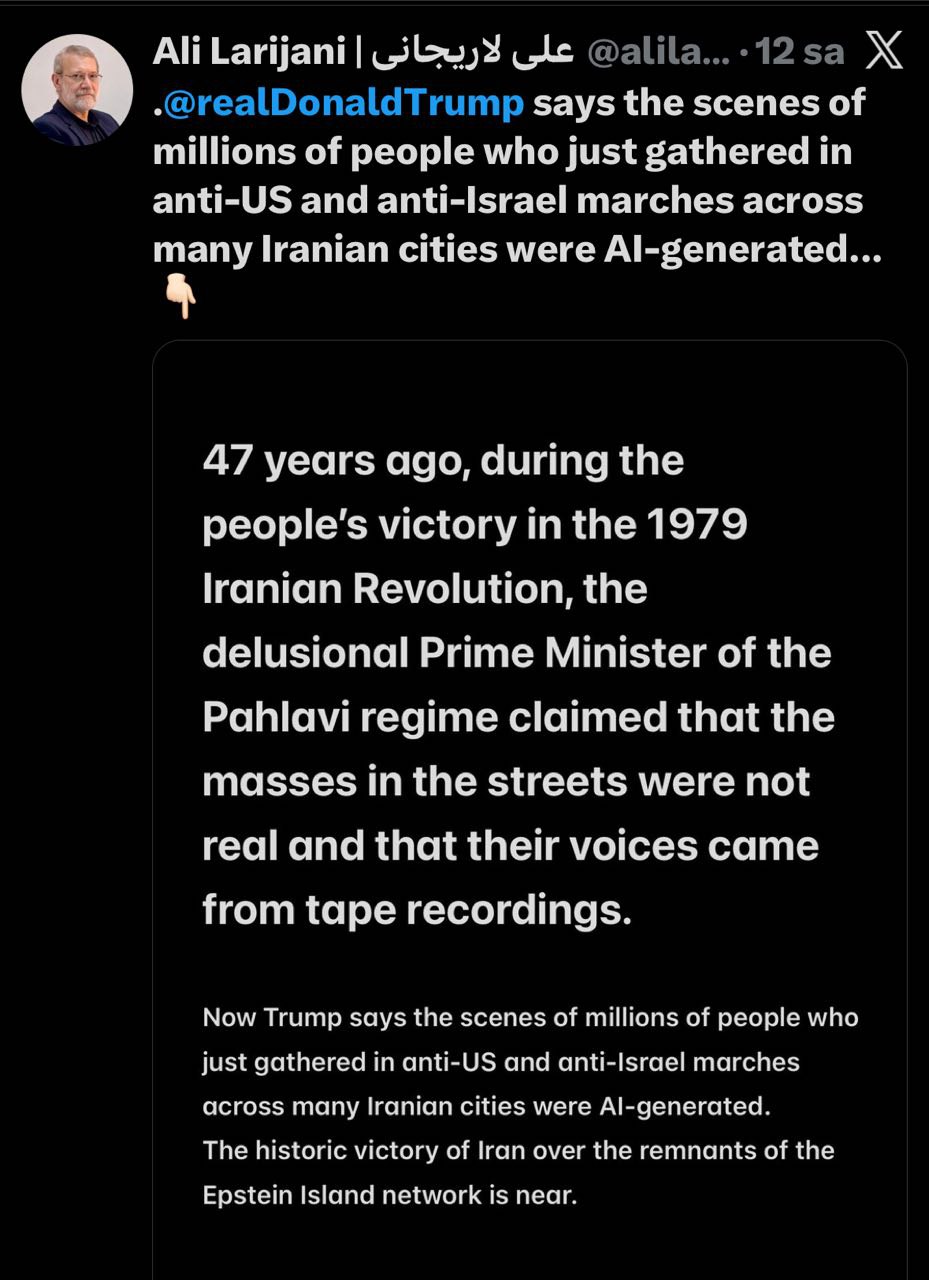 “47 il əvvəl – İran inqilabı ərəfəsində, şah Məhəmməd Rza Pəhləvi rejiminin baş naziri küçələrə çıxan insanların real olmadığını, onların səslərinin maqnitofondan verildiyini iddia edirdi. Hazırda ABŞ-ın prezidenti Donald Tramp də oxşar açıqlamalar verir və İranda keçirilən çoxmilyonlu antiamerika və antiisrail aksiyalarının süni intellekt vasitəsilə yaradıldığını iddia edir. Ancaq İran xalqının Epşteyn adası şəbəkəsinin qalıqları üzərində tarixi qələbəsi yaxındır”.