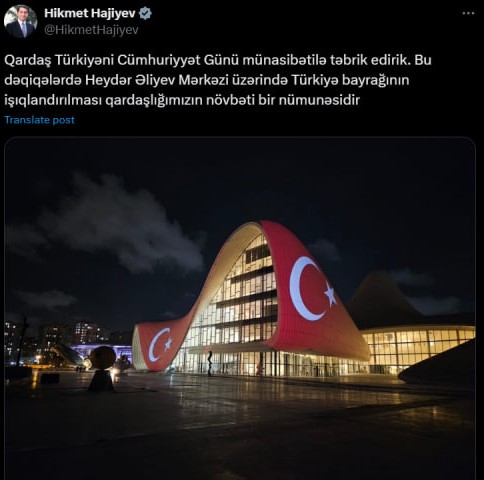 "Qardaş Türkiyəni Cümhuriyyət Günü münasibətilə təbrik edirik. Bu dəqiqələrdə Heydər Əliyev Mərkəzi üzərində Türkiyə bayrağının işıqlandırılması qardaşlığımızın növbəti bir nümunəsidir", - paylaşımda qeyd olunub.
