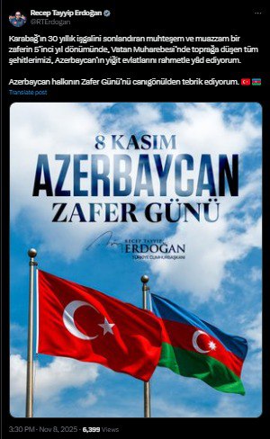 Türkiyə Prezidenti Rəcəb Tayyib Ərdoğan 8 Noyabr – Zəfər Günü ilə bağlı paylaşım edib.