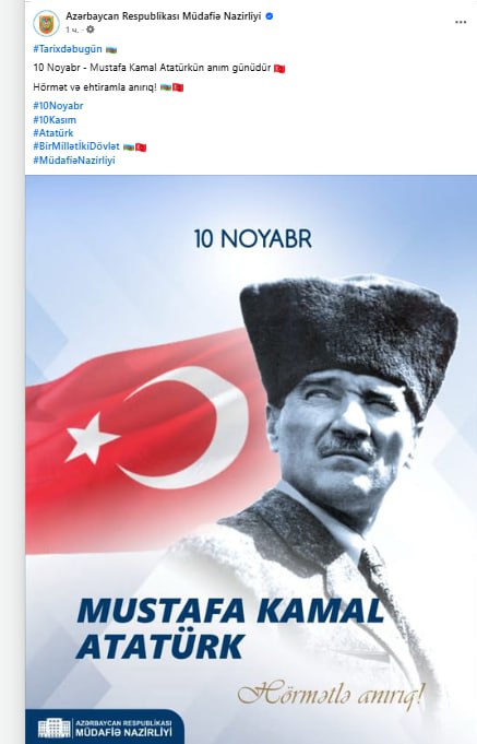 Azərbaycan Müdafiə Nazirliyi Mustafa Kamal Atatürkün vəfatının 87-ci ildönümü ilə bağlı paylaşım edib.