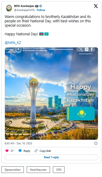 Azərbaycan Xarici İşlər Nazirliyi (XİN) Qazaxıstanı Milli Günü münasibətilə təbrik edib.