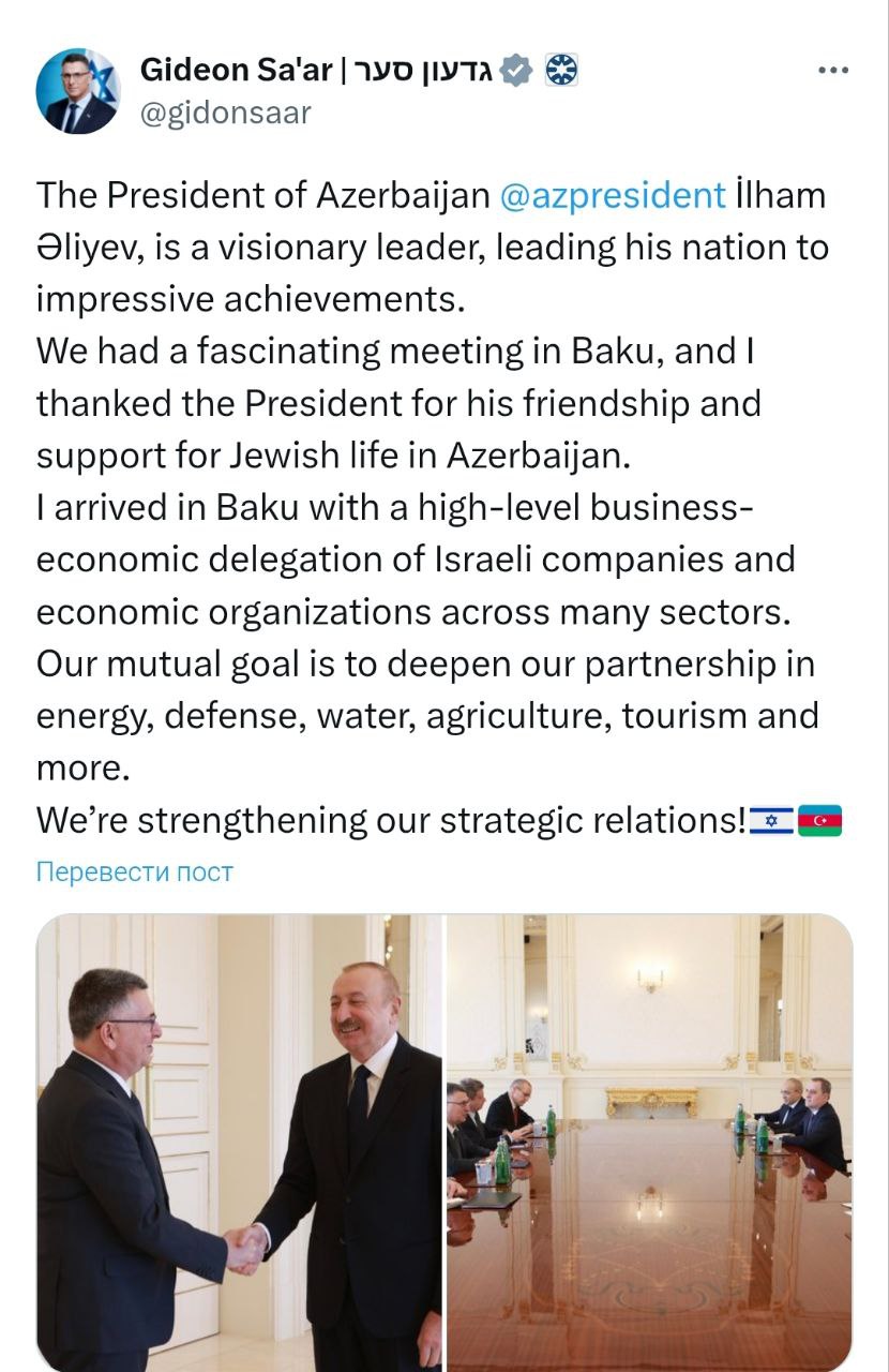 “Bakıda çox maraqlı bir görüşümüz oldu və mən Prezidentə dostluğuna, həmçinin Azərbaycanda yəhudi icmasına verdiyi dəstəyə görə təşəkkür etdim. Bakıya müxtəlif sahələri əhatə edən İsrail şirkətləri və iqtisadi təşkilatlardan ibarət yüksək səviyyəli biznes-iqtisadi nümayəndə heyəti ilə gəldim. Ortaq məqsədimiz enerji, müdafiə, su, kənd təsərrüfatı, turizm və digər sahələrdə əməkdaşlığımızı daha da dərinləşdirməkdir. Biz strateji münasibətlərimizi gücləndiririk", - deyə o paylaşımda bildirib.