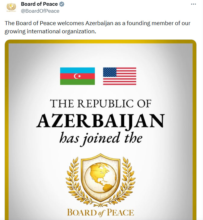 ABŞ Prezidenti Donald Trampın təşəbbüsü ilə yaradılan Sülh Şurası Azərbaycanı təsisçi üzv kimi salamlayıb.