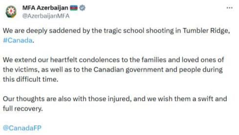 “Biz Kanadanın Tambler-Ric şəhərindəki məktəbdə baş vermiş faciəvi hadisə ilə bağlı dərin kədər hissi keçiririk.
