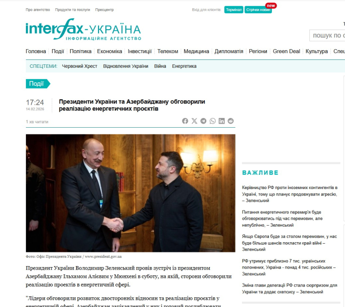 Bizim.Media xəbər verir ki, “Ukrinform” dövlət informasiya agentliyi, “İnterfaks-Ukrayna”, “RBK-Ukrayna”, “UNİAN”, “Cenzor”, “Gordon”, “Ukrainska Pravda”, “24tv.ua”, “Korrespondent” və digər informasiya agentlikləri, xəbər portallarında dərc edilən məqalələrdə Prezident İlham Əliyevin Azərbaycan və Ermənistan arasında paraflanmış sülh sazişinə, Rusiya tərəfindən Azərbaycanın Ukraynadakı enerji infrastrukturlarına, səfirliyinə hücumlarına dair fikirlərinə, Azərbaycan və Ukrayna prezidentləri arasında keçirilən görüş yer alıb.