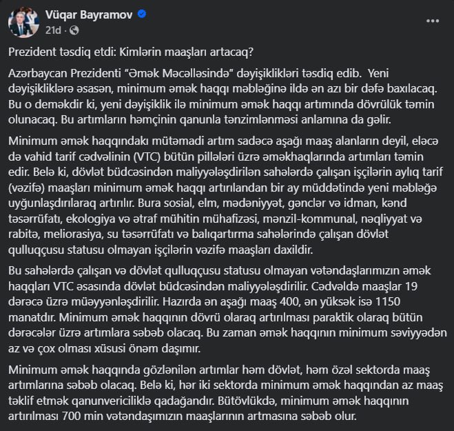 "Minimum əmək haqqındakı mütəmadi artım sadəcə aşağı maaş alanların deyil, eləcə də vahid tarif cədvəlinin (VTC) bütün pillələri üzrə əmək haqlarında artımları təmin edir. Belə ki, dövlət büdcəsindən maliyyələşdirilən sahələrdə çalışan işçilərin aylıq tarif (vəzifə) maaşları minimum əmək haqqı artırılandan bir ay müddətində yeni məbləğə uyğunlaşdırılaraq artırılır. Bura sosial, elm, mədəniyyət, gənclər və idman, kənd təsərrüfatı, ekologiya və ətraf mühitin mühafizəsi, mənzil-kommunal, nəqliyyat və rabitə, meliorasiya, su təsərrüfatı və balıqartırma sahələrində çalışan dövlət qulluqçusu statusu olmayan işçilərin vəzifə maaşları daxildir.