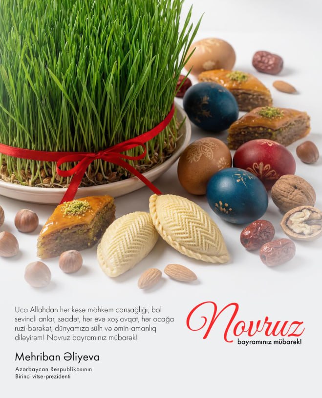 “Uca Allahdan hər kəsə möhkəm can sağlığı, bol sevincli anlar, səadət, hər evə xoş ovqat, hər ocağa ruzi-bərəkət, dünyamıza sülh və əmin-amanlıq diləyirəm! Novruz bayramınız mübarək!”