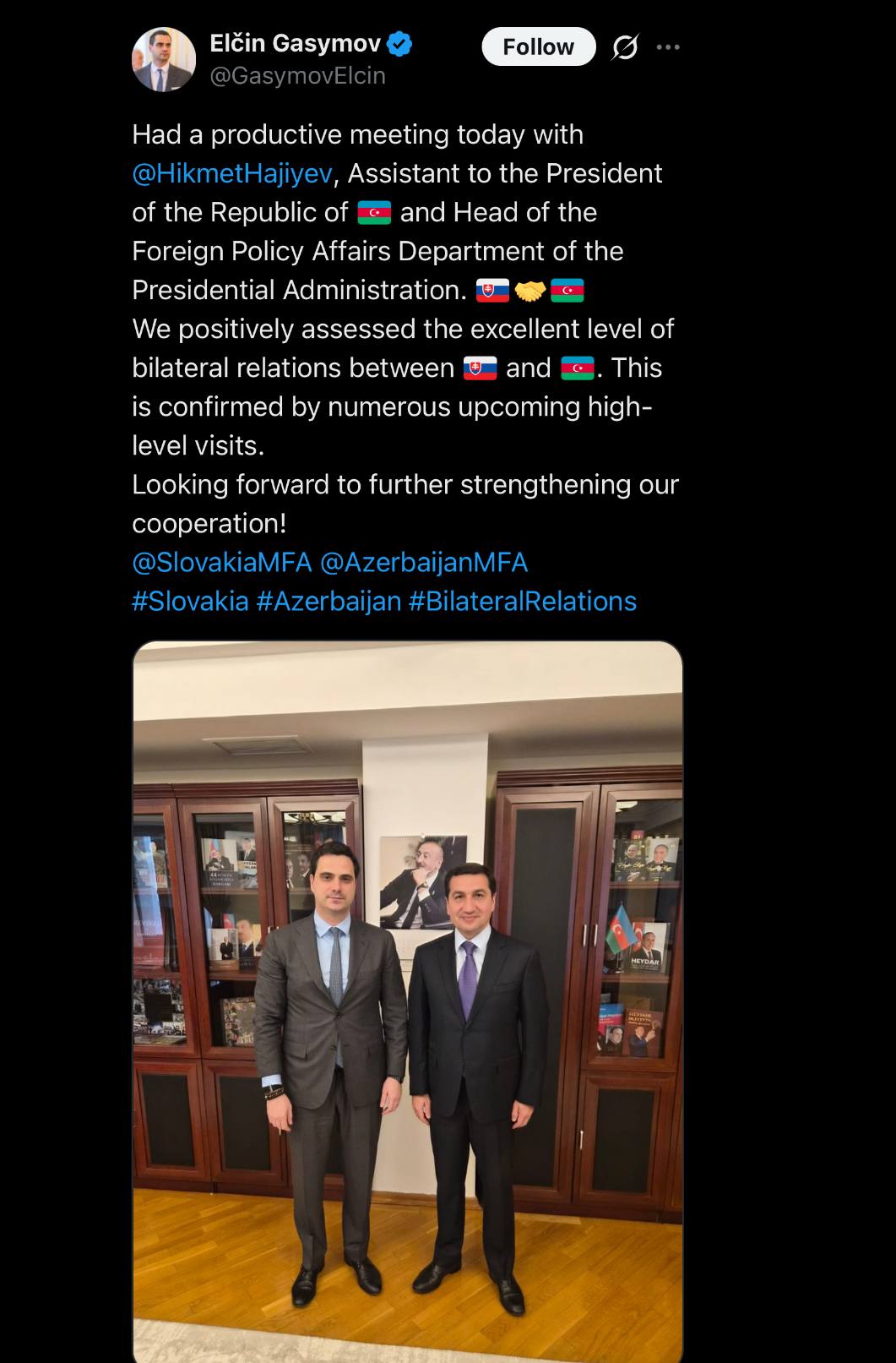 Bizim.Media xəbər verir ki, bu barədə slovakiyalı səfir görüşün yekunlarına dair "X" sosial şəbəkə hesabında yazıb.