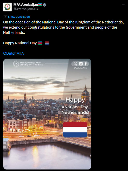 "Niderland Krallığının Milli Günü münasibətilə Niderland hökumətini və xalqını ürəkdən təbrik edirik. Milli Gününüz mübarək!", - paylaşımda qeyd olunub.
