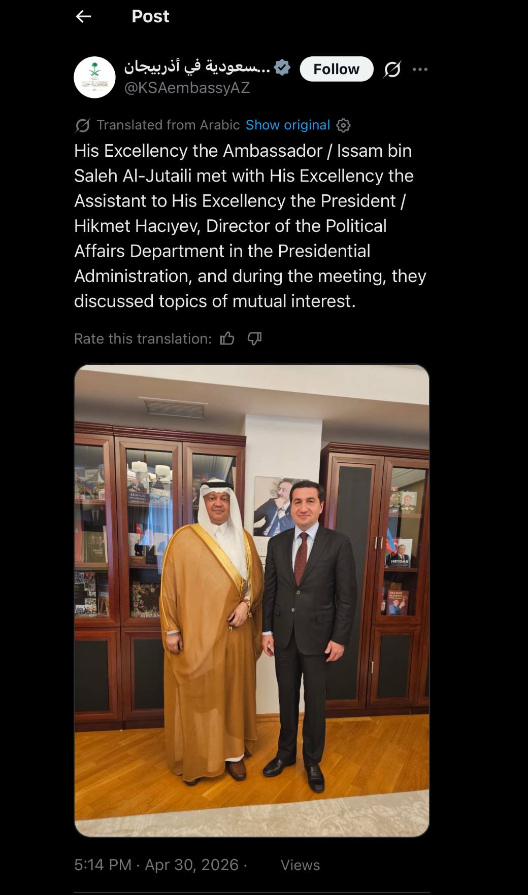 Prezidentin köməkçisi, Prezident Administrasiyasının (PA) Xarici siyasət məsələləri şöbəsinin müdiri Hikmət Hacıyev Səudiyyə Ərəbistanının Azərbaycandakı səfiri İssam bin Saleh əl-Cuteyli ilə görüşüb.